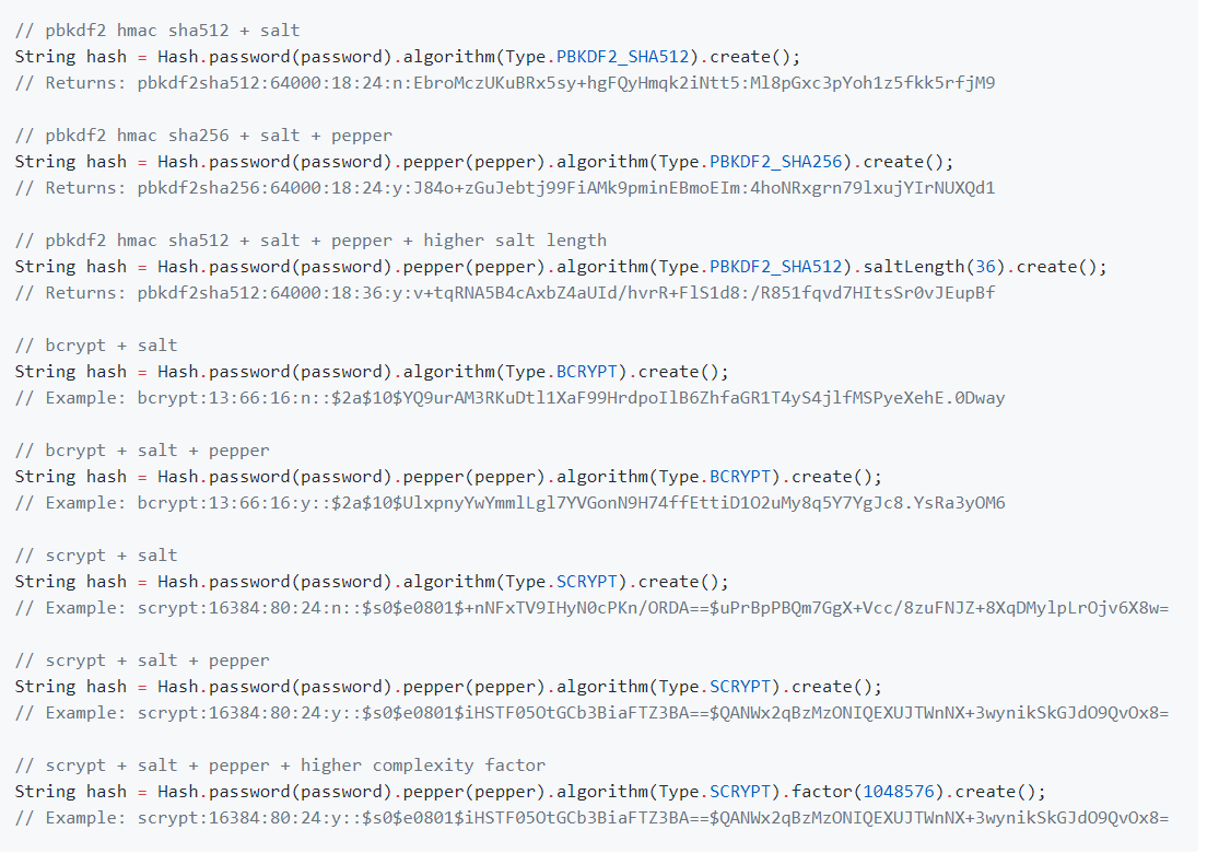 String hash = Hash.password(password).algorithm(Type.BCRYPT).create();